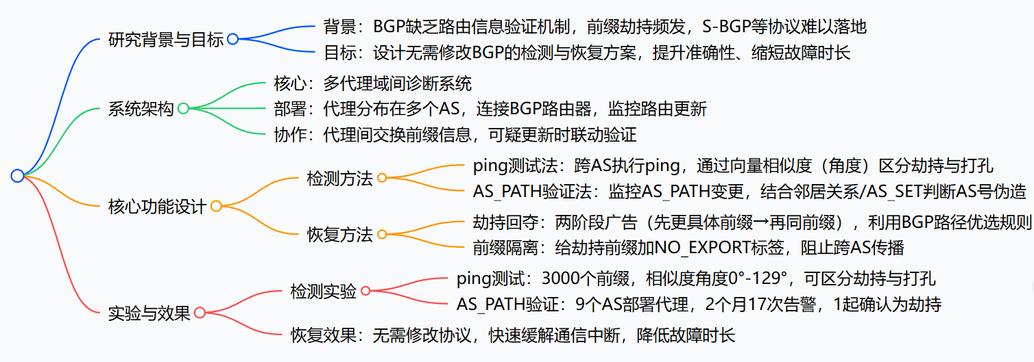 - 核心目标:① 准确检测前缀劫持(含 AS 号伪造场景);② 快速恢复通信,缩短故障 downtime。