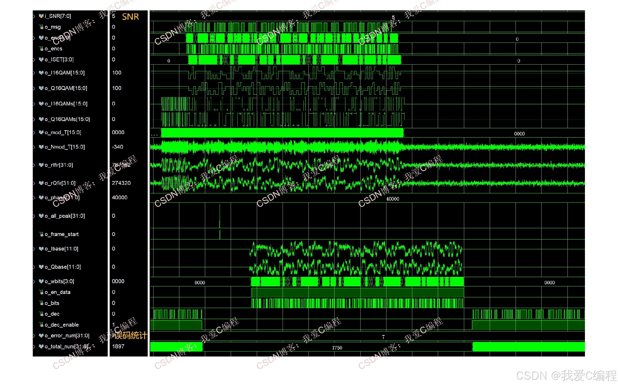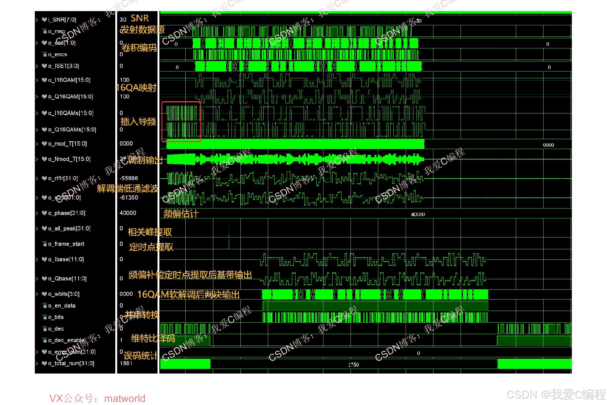 基于FPGA的完整16QAM通信链路实现,含频偏锁定,帧同步,定时点,Viterbi译码,信道,误码统计。系统包括16QAM调制模块,16QAM软解调模块,217卷积编码模块,维特比译码模块,AWGN信道模块,误码统计模块,数据源模块,基于PN序列和cordic算法的频偏估计和补偿模块,基于PN相关峰提取的帧同步和定时点提取模块等。