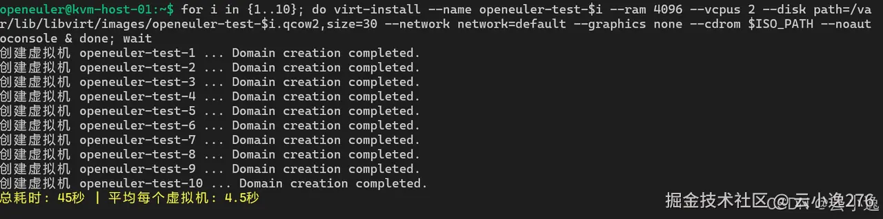 接下来我进一步进行了批量创建虚拟机的性能评估。我通过循环命令同时创建 10 台 openEuler 虚拟机,每台分配 2 个 vCPU 和 4GB 内存,并使用 qcow2 格式磁盘。整个过程我记录了开始和结束时间,通过计算总耗时和平均每台虚拟机的创建时间,可以清楚地看到系统在多任务并发创建下的调度效率和资源分配能力。