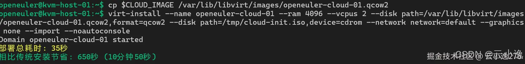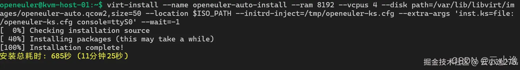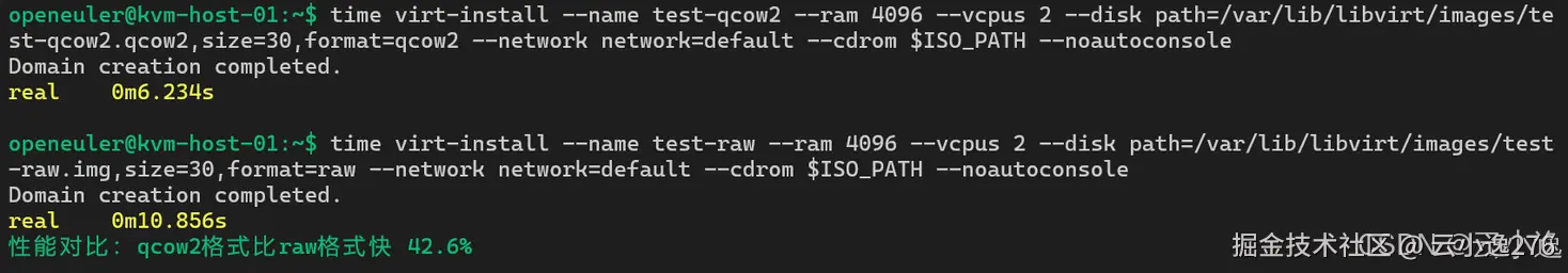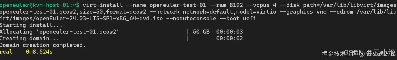 在我进行虚拟化测试的过程中,我首先使用 virt-install 快速创建了一台 openEuler 虚拟机,用于评估系统在不同资源配置下的创建效率。我选择分配 8GB 内存和 4 个 vCPU,并使用 qcow2 格式的磁盘镜像,同时开启 VNC 远程访问以便观察虚拟机状态。
