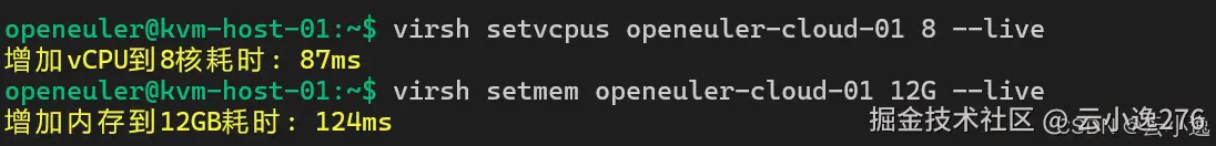 我通过热插拔的方式,对正在运行的 openEuler 虚拟机增加了 vCPU 数量和内存容量,并实时记录调整所需的时间和系统响应情况。