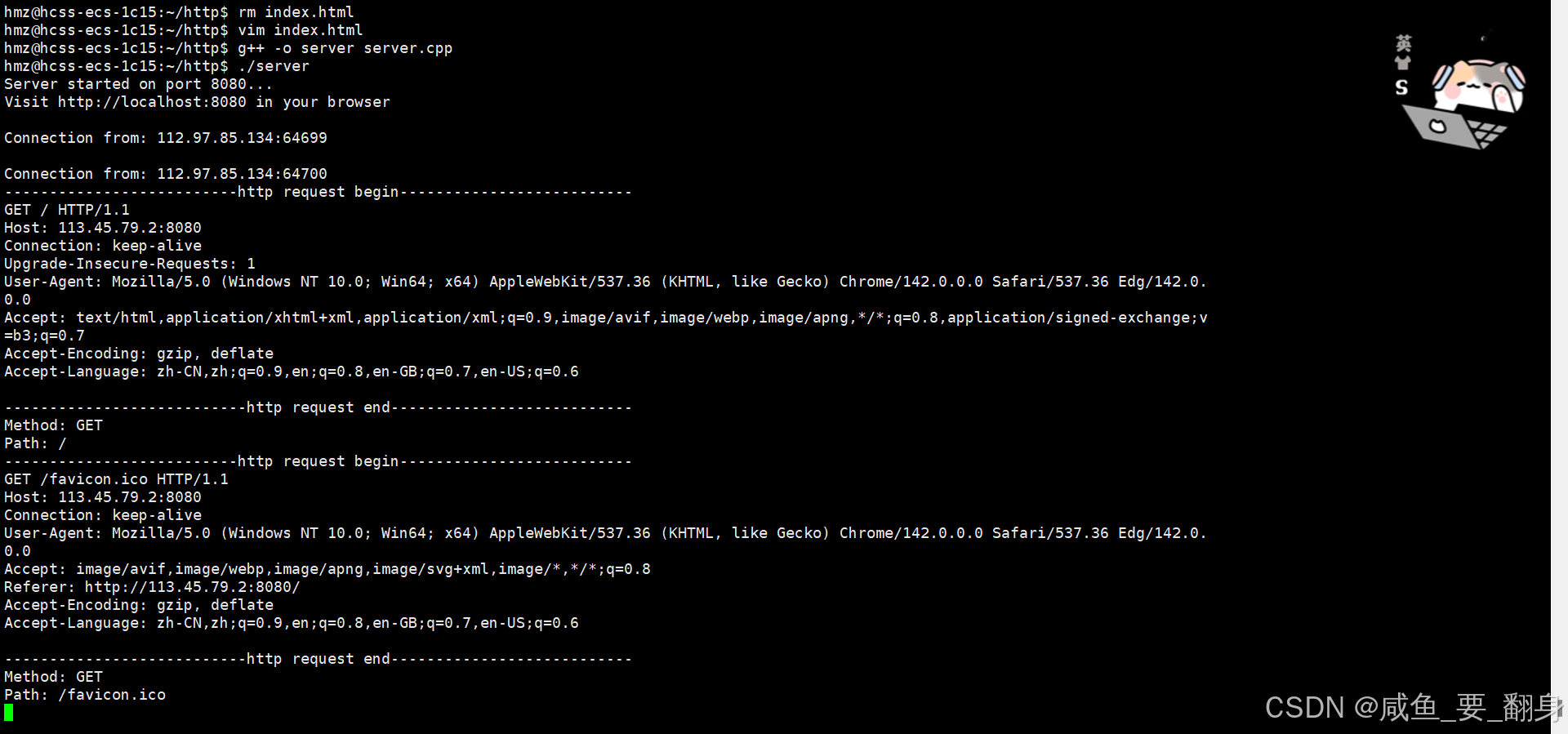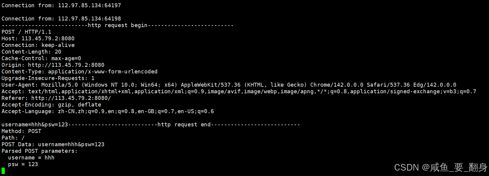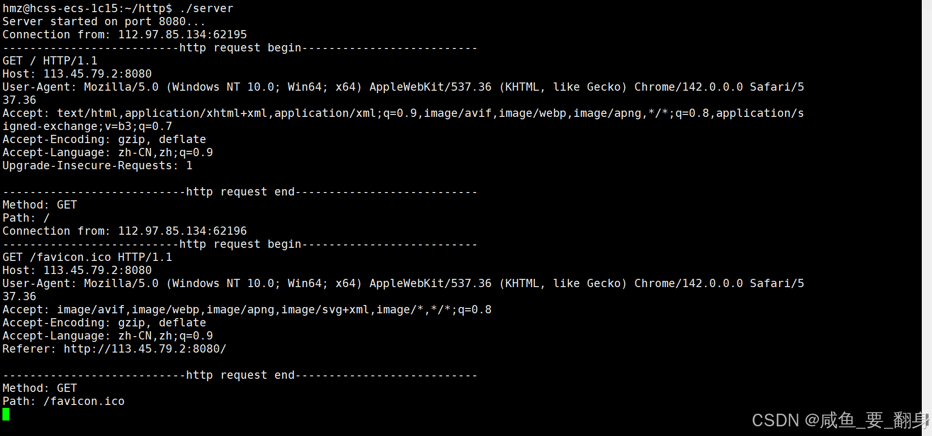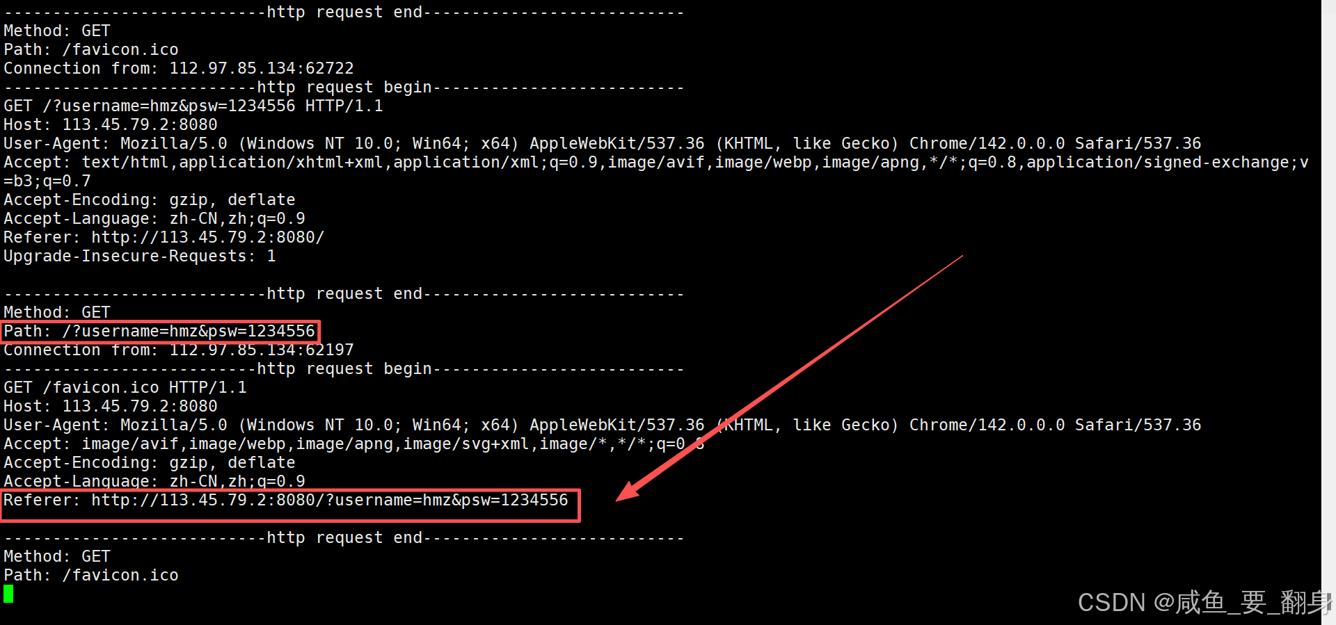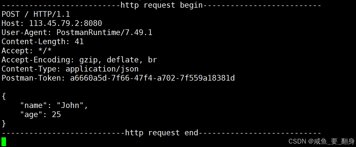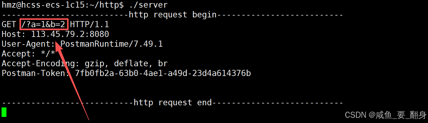 此时在服务器收到的 HTTP 请求中,可以在请求行中的 URL 里看到我们刚才在 Postman 中设置的参数。这表明 GET 方法确实是通过 URL 来传递参数的。