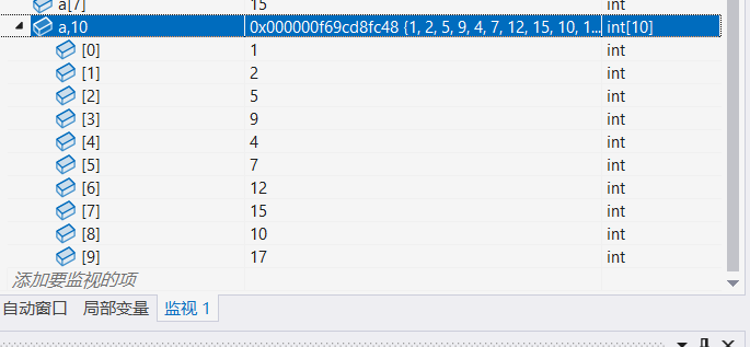 若数组是动态分配的(如 int *a = (int*)malloc(10*sizeof(int));),在监视窗口输入 a,10(逗号后加元素个数),即可显示从 a 指向地址开始的 10 个元素。