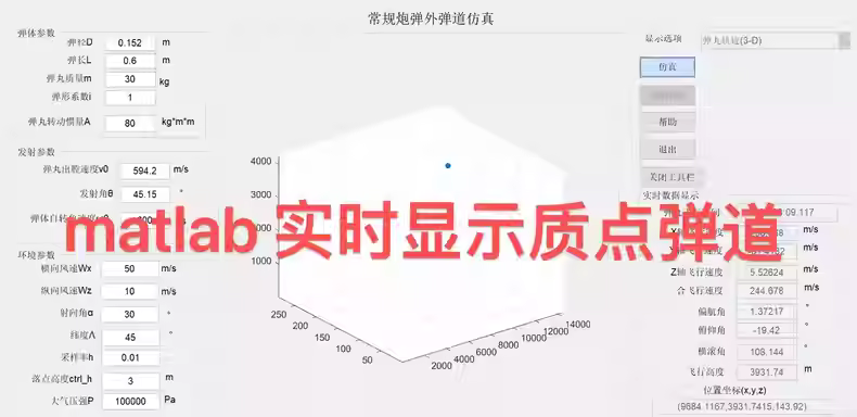 Matlab弹道仿真软件,界面实时显示弹道,提供源码,同时提供常规弹外弹道仿真软件使用说明书。 对弹丸的运动轨迹,速度轨迹,姿态信息进行实时仿真,并且运用柔格里半经验公式对滚转信息的仿真,进而是本软件能够全面的反映出弹丸在空间飞行时的各项基本信息。