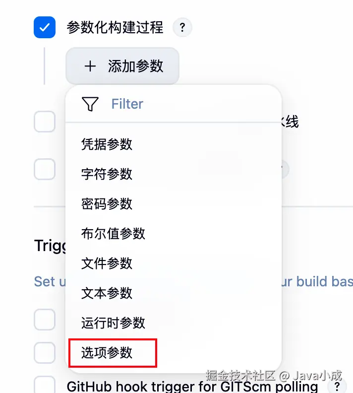 勾选 "参数化构建过程" ,点击 "添加参数" → 选择 "选项参数":