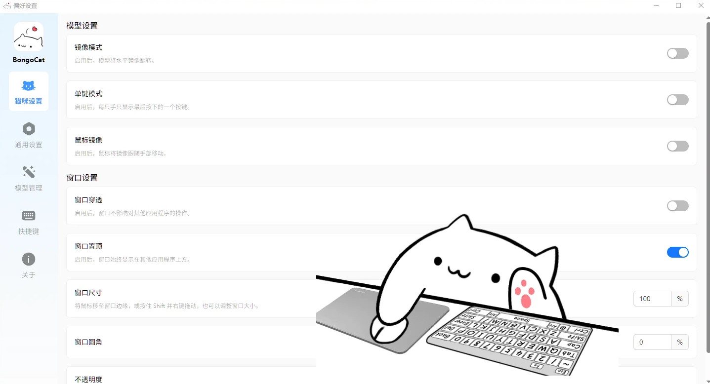 BongoCat支持用户导入自定义模型,这为个性化表达提供了广阔空间。无论是动漫角色、原创形象还是节日主题皮肤,用户都可以通过简单的拖拽操作完成模型更换。社区中已有大量创意十足的模型资源,从简约风格到复杂设计应有尽有。