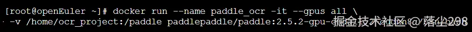 创建一个交互式容器,并将宿主机的项目目录(例如/home/ocr_project)挂载到容器内部的/paddle目录,方便进行代码开发和数据交互。--gpus all参数使得容器可以访问宿主机的所有GPU资源。