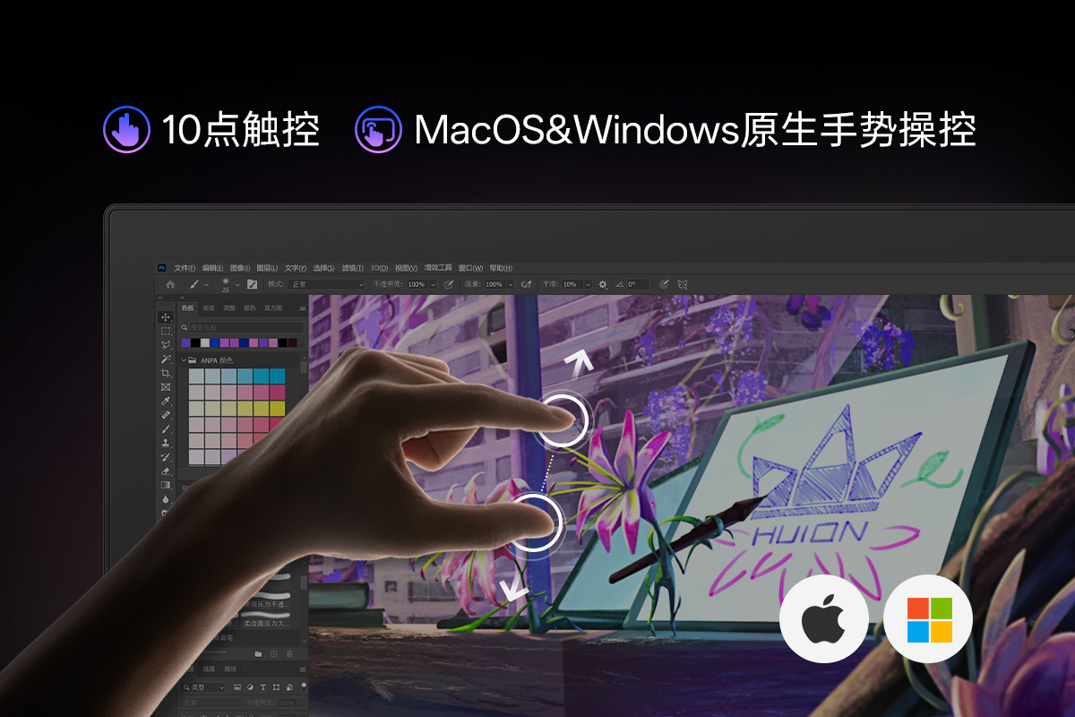 基于对性能与体验的深入考量,新品搭载十点触控技术,支持Windows和macOS两大主流系统的原生手势操控。创作时,指尖的直接点选和手势操作,再配合数位笔实现手笔双触,便捷之余生产力效率更加突出,让创意得以无限释放。