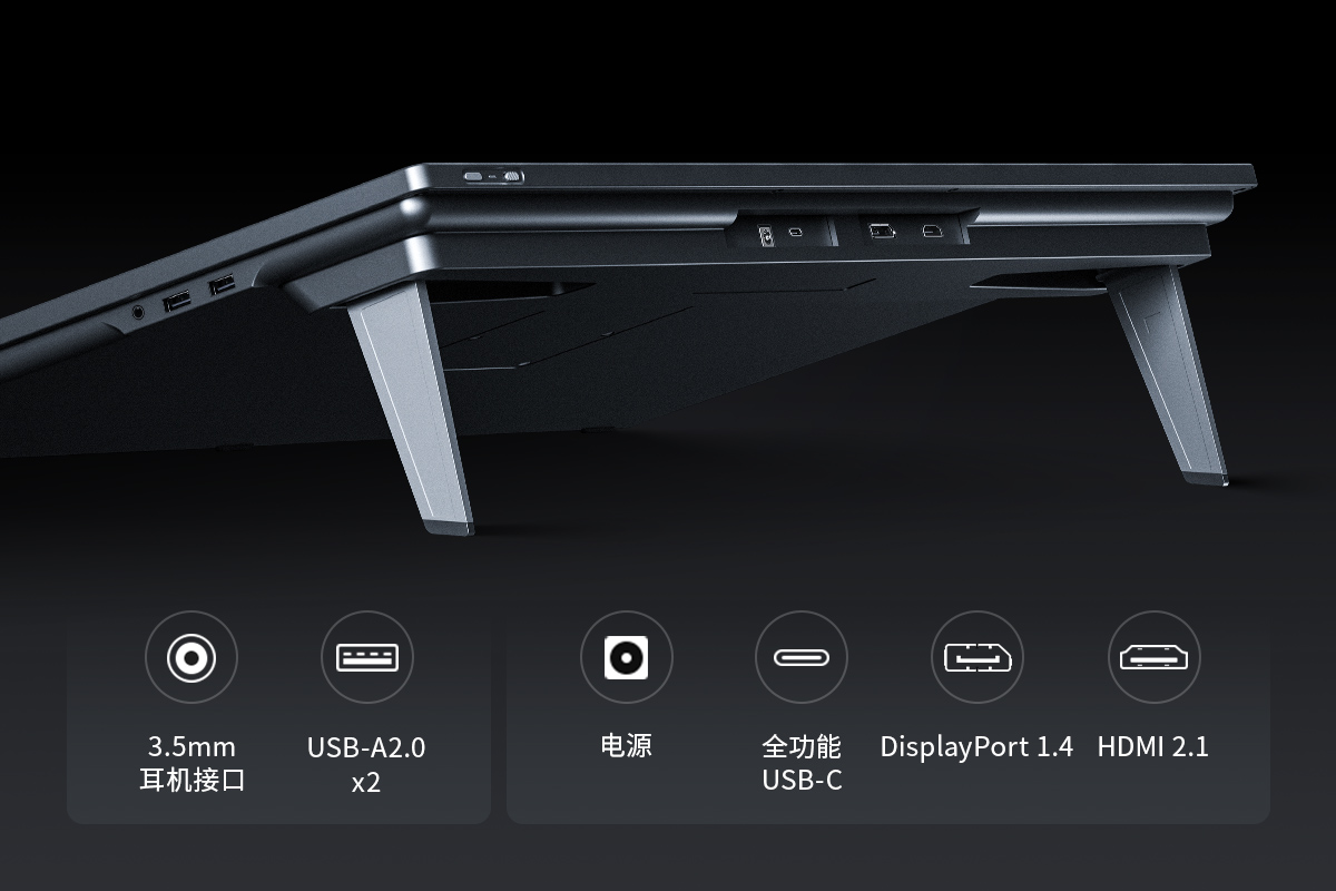 拓展性能方面,Kamvas Pro 27 (144Hz)设计了丰富的接口功能。机身布局了HDMI、DP、USB-A、全功能USB-C以及3.5mm耳机接口。这意味着,用户不仅可以通过多种方式进行设备连接,键鼠、耳机、U盘或移动硬盘等外设连接时也更加方便,极大提升了使用时的灵活性与可用性。