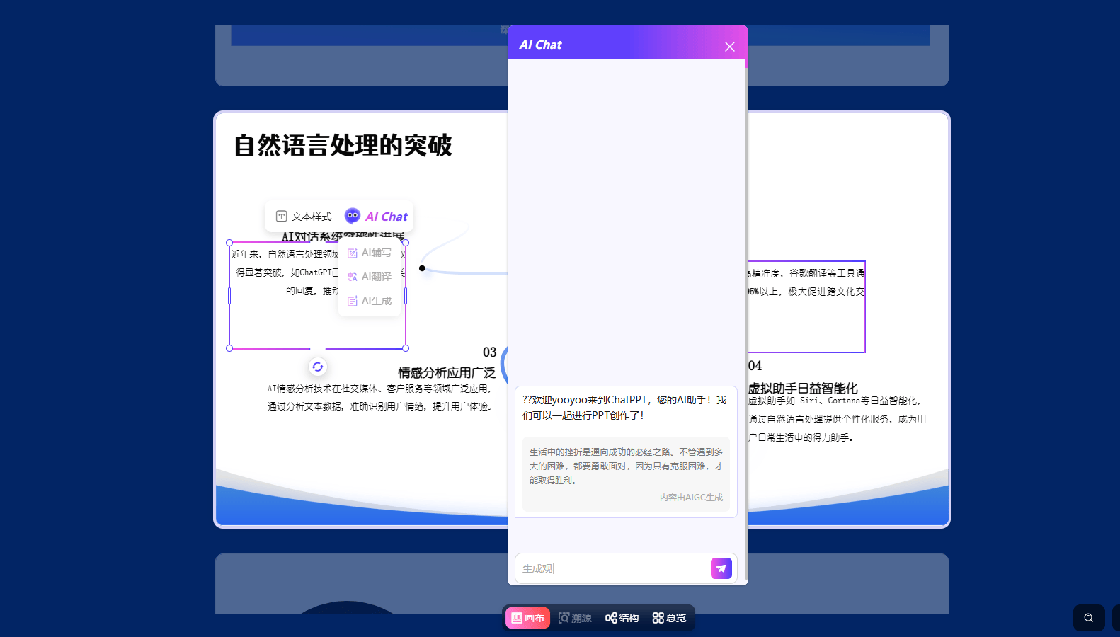 ChatPPT的核心魅力在于它"能聊天"。它不是一次性生成就结束,而是允许你在生成过程中,通过自然的对话指令不断调整和优化。