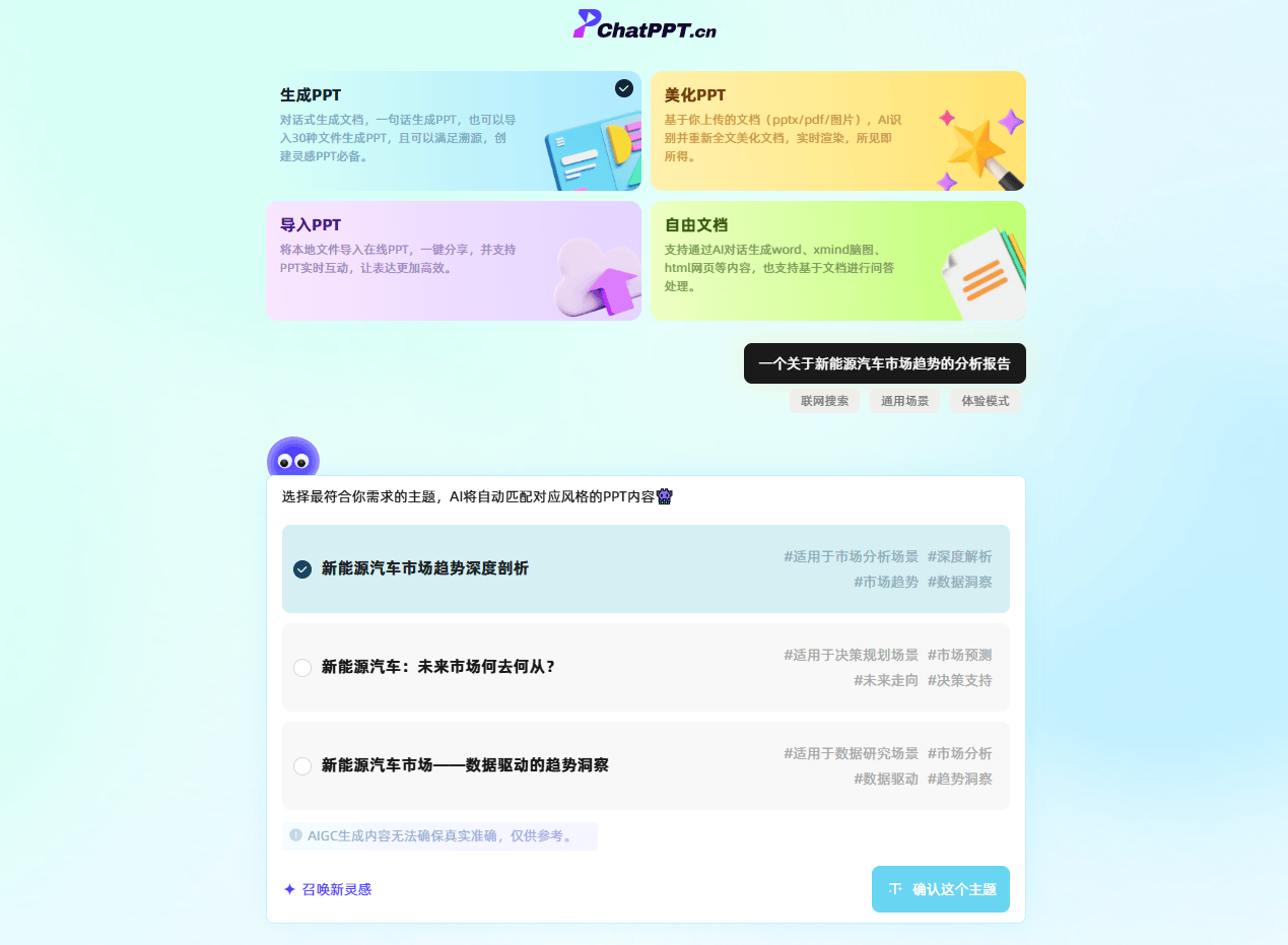 | 需要高度定制、反复修改打磨 | ChatPPT | 对话式交互让你能精准控制内容和设计的每一步。 |