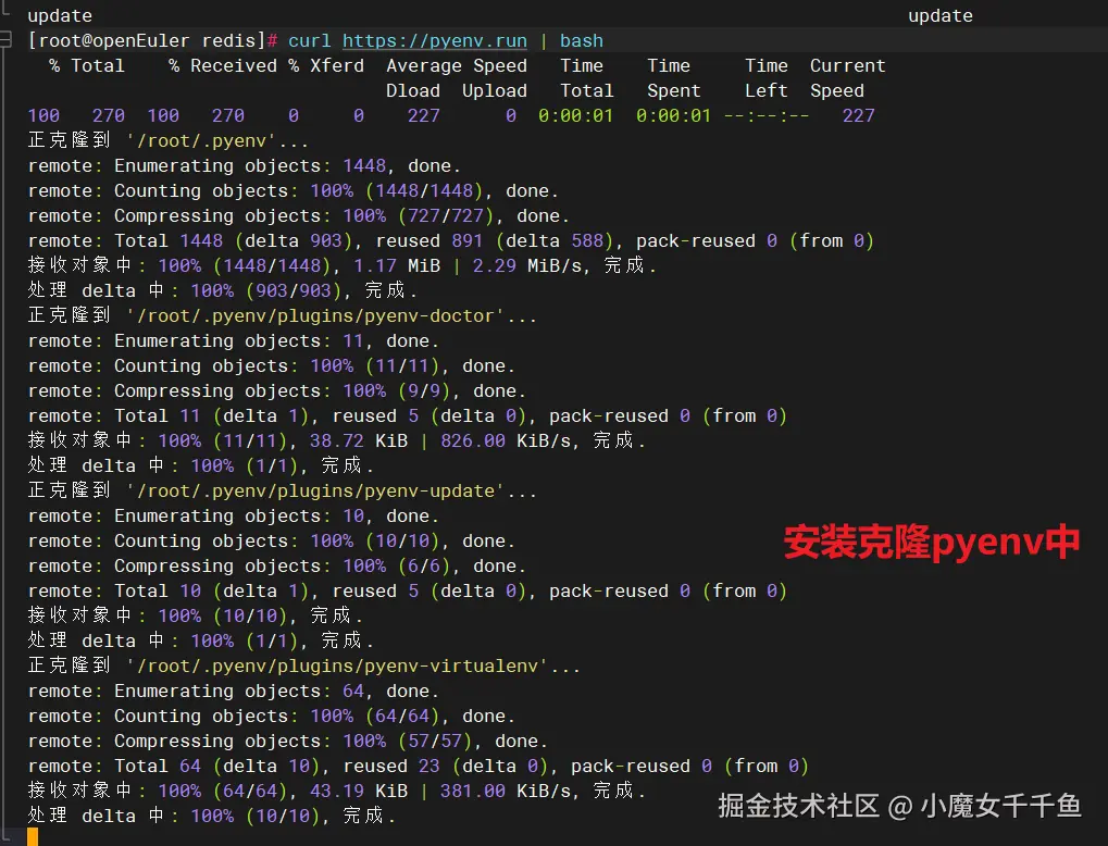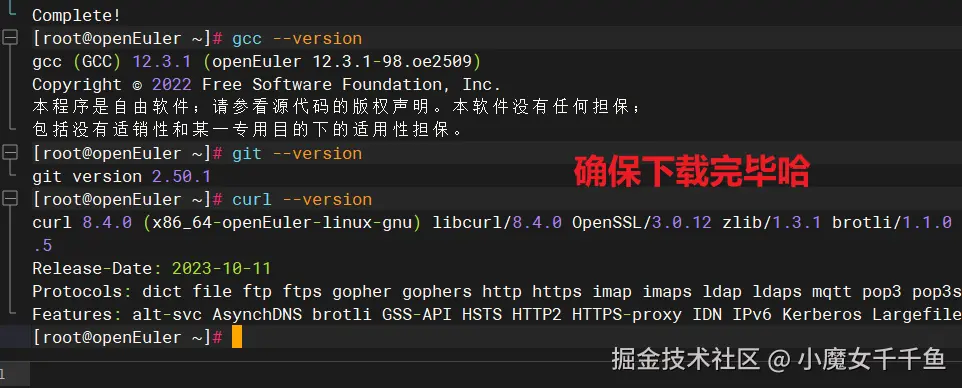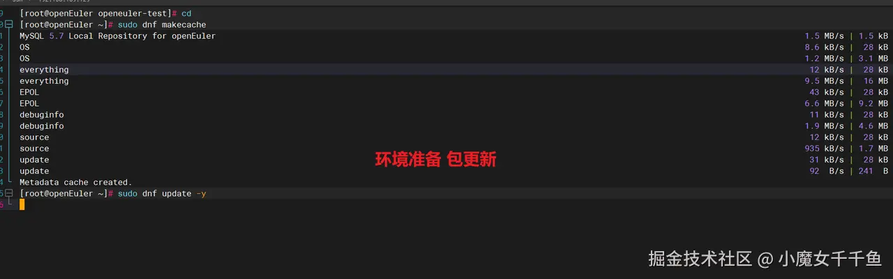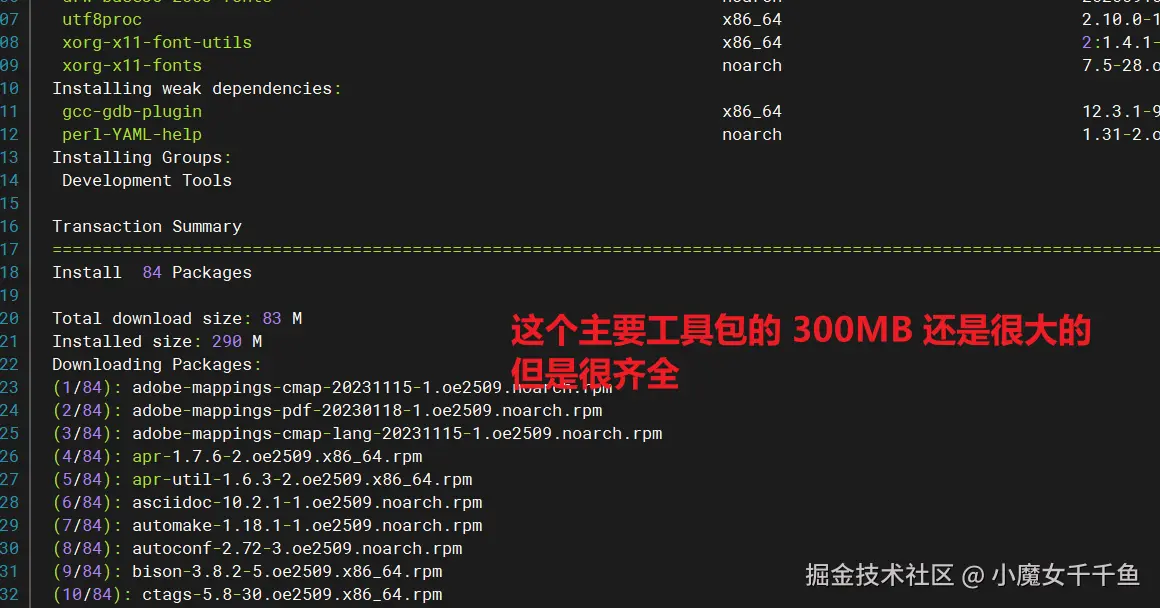说明 :dnf 是 openEuler 的包管理器。makecache 命令会刷新软件源缓存,update -y 会自动确认更新所有软件包。这个过程可能需要 3-5 分钟,取决于你的网络速度。 步骤 3:安装开发工具组