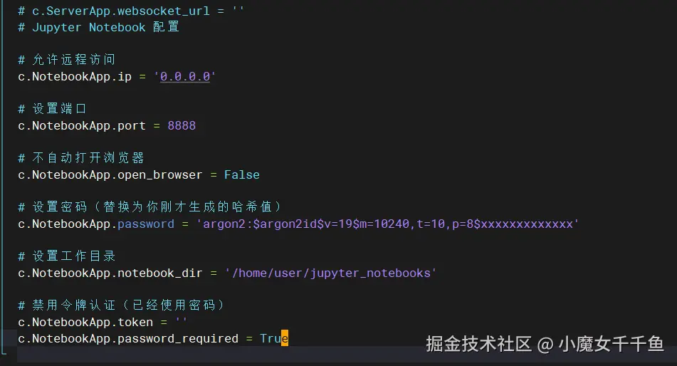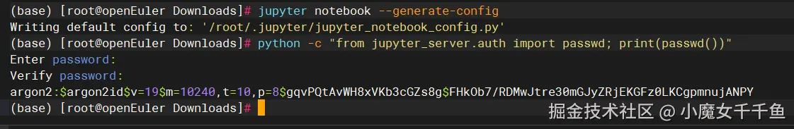 系统会提示你输入密码(输入时不显示),然后输出密码哈希值。 步骤 3:编辑 Jupyter 配置文件
