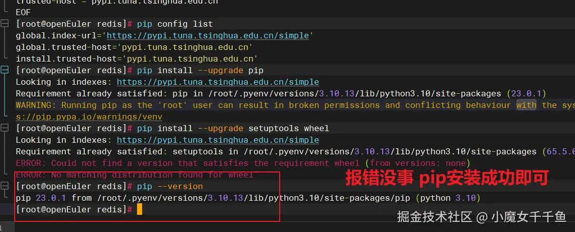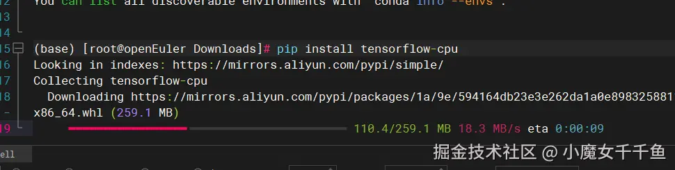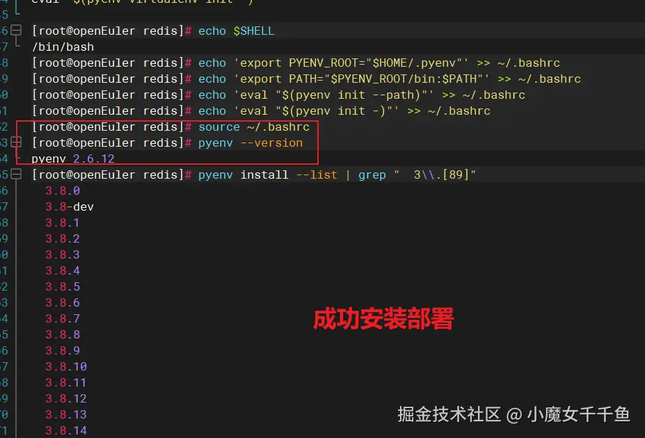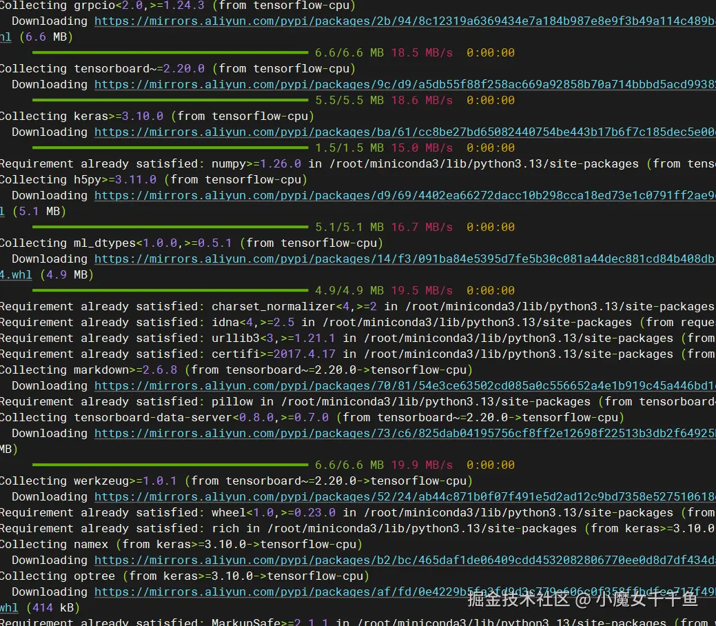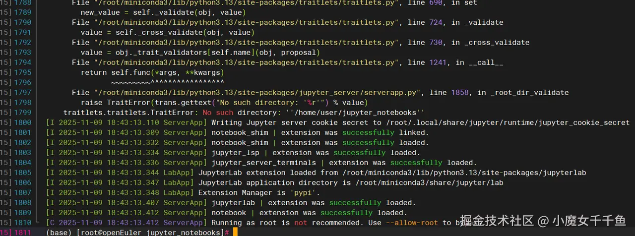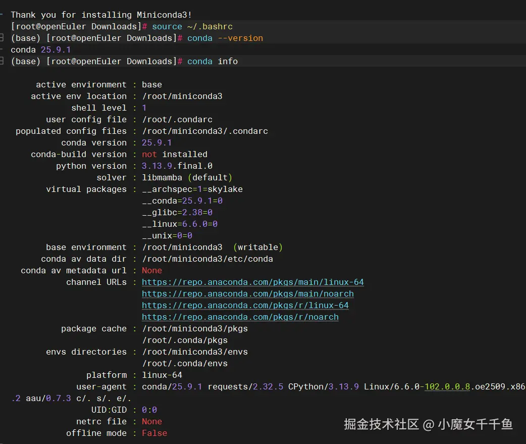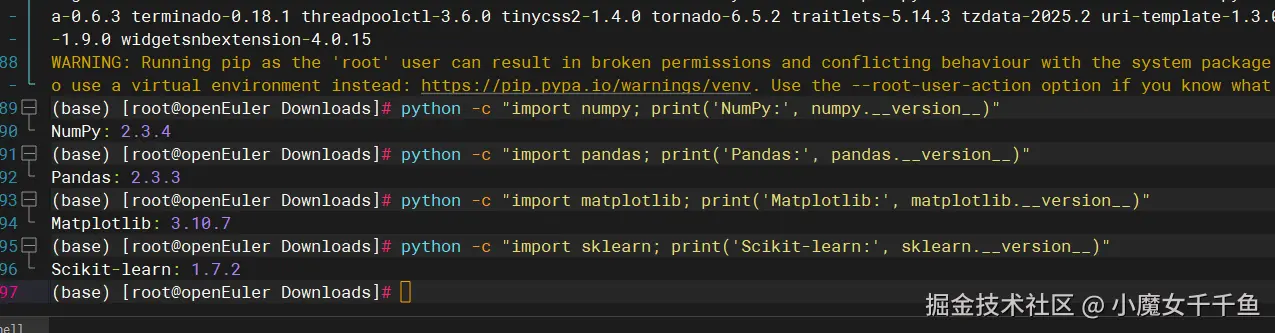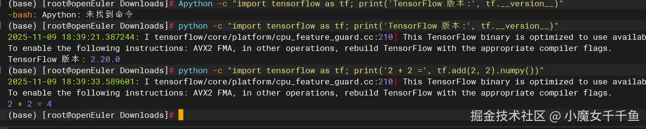 恭喜!你已经在 openEuler 25.09 上成功搭建了完整的 AI 开发环境。 ✅ 系统准备 - 更新系统、安装开发工具、配置国内镜像源 ✅ Python 管理 - 使用 pyenv 管理 Python 版本 ✅ Anaconda 环境 - 安装 Miniconda 和常用科学计算库 ✅ Jupyter 配置 - 配置远程访问和密码保护 ✅ AI 框架 - 安装 TensorFlow 和 PyTorch 并验证