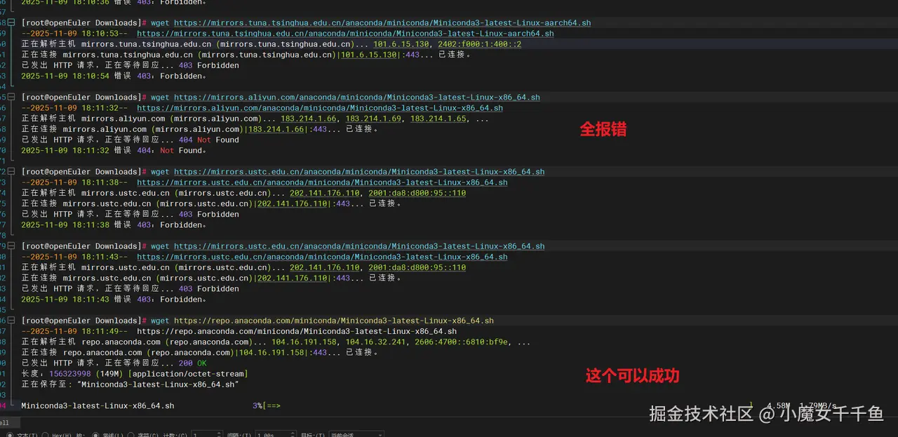 为了提高软件下载速度,我们配置国内的镜像源。 重要提示:openEuler 25.09 是创新版本,部分国内镜像源可能尚未完全同步。���们提供多个镜像源方案供选择。 声明: 以下方法选择一个就行 因为很多源有时候链接不上 我都放在下方让大家去试试