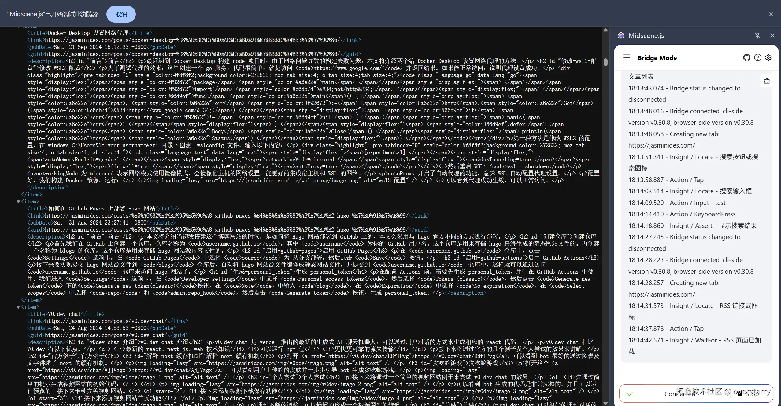 配置完 mcp server 后,在浏览器扩展中打开桥接模式,设置允许连接,然后在编辑器输入 使用 midscene打开 https://jasminides.com/,生成网站的Playwright 自动化测试用例,测试以下功能:文章的打开关闭,tag页的功能,搜索页的功能,rss页的功能,将生成的用例保存到ut.ts文件中 过了一会任务执行完,可以看到代码顺利生成。