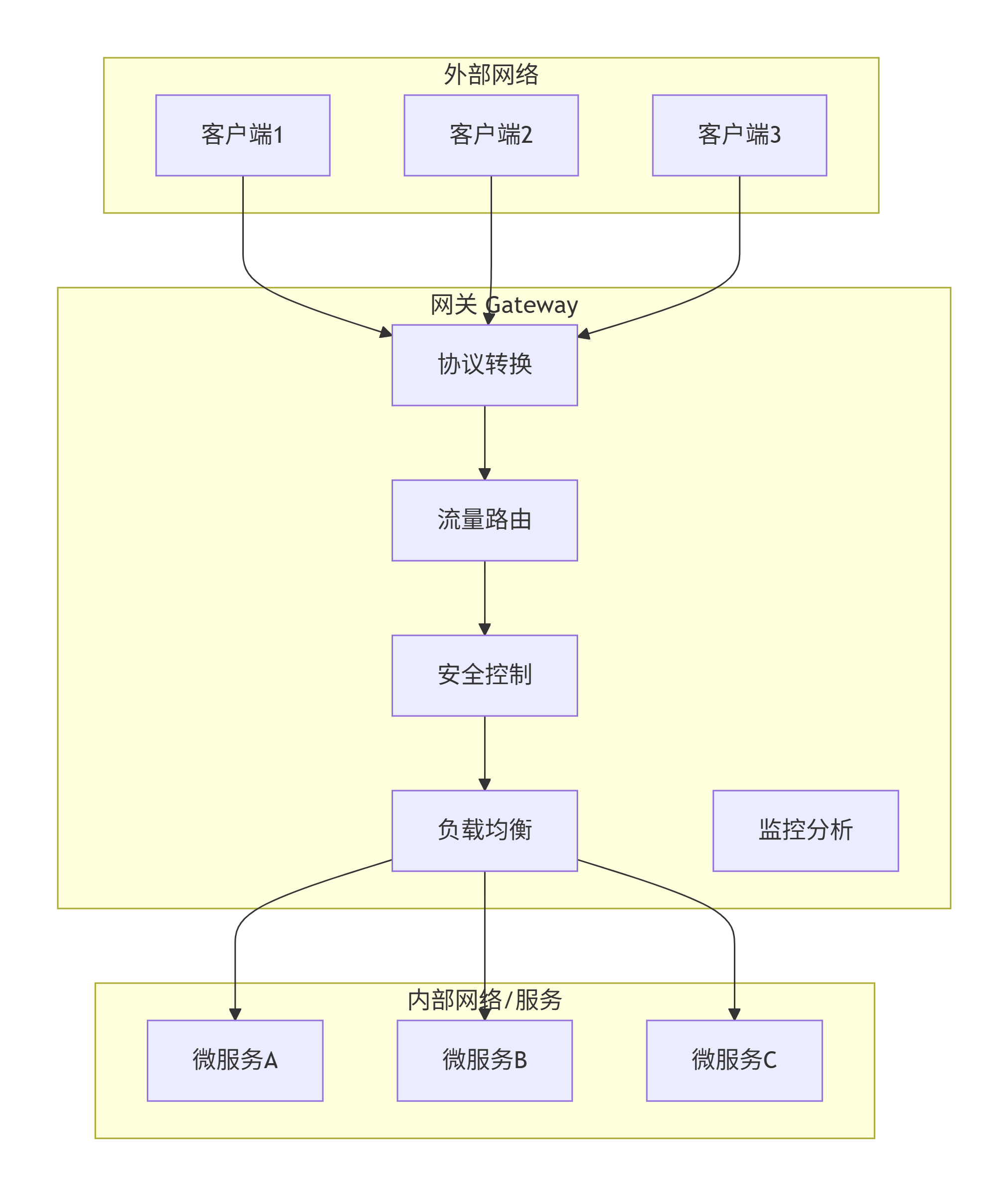 网关(Gateway) 是在不同网络或协议之间进行协议转换、流量路由和安全控制 的中间件系统。它类似于现实世界中的交通枢纽,负责接收、处理并转发来自不同方向的流量。