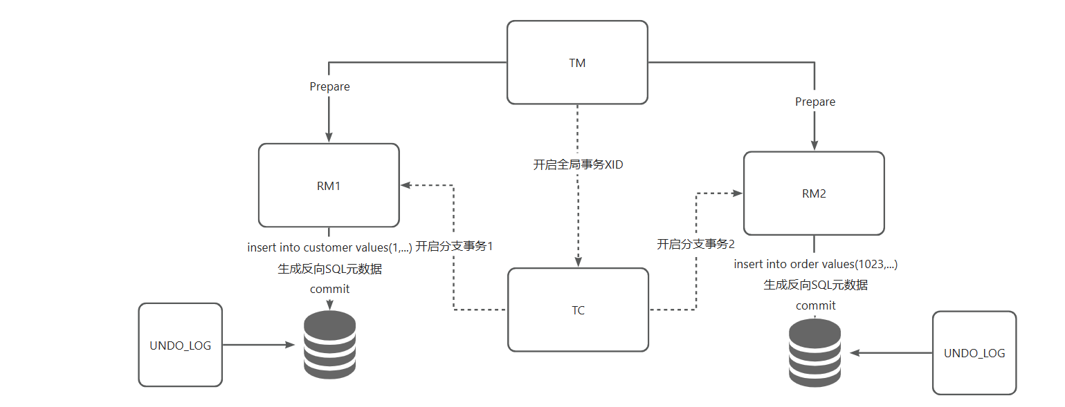 事物管理者(TM)下达指令给到事物协调者(TC),事物协调者(TC)再开启两个分支事物,控制RM1、RM2的事物执行。