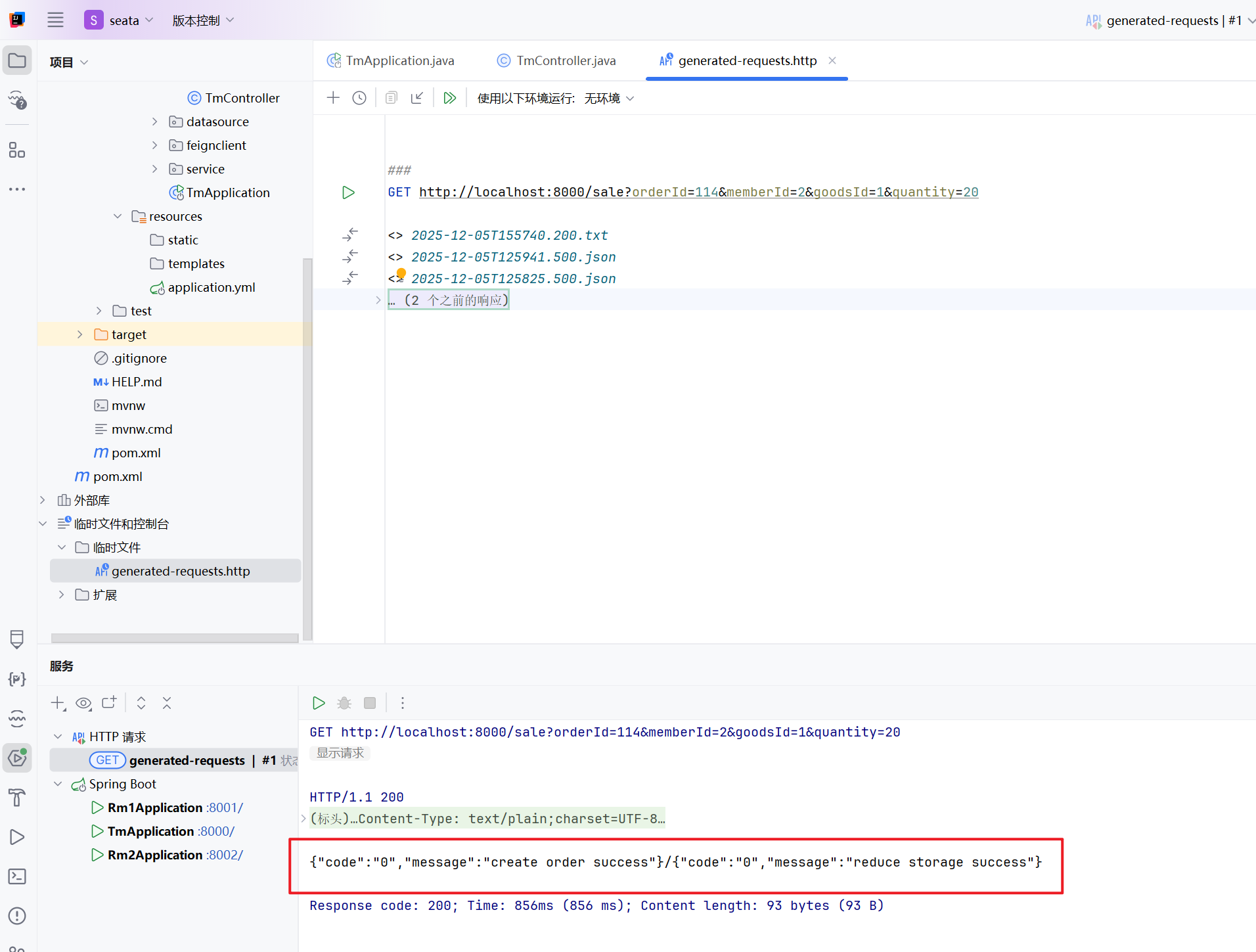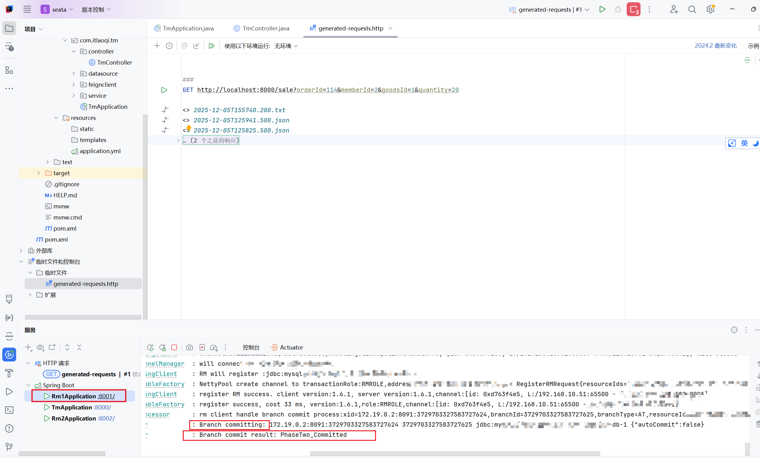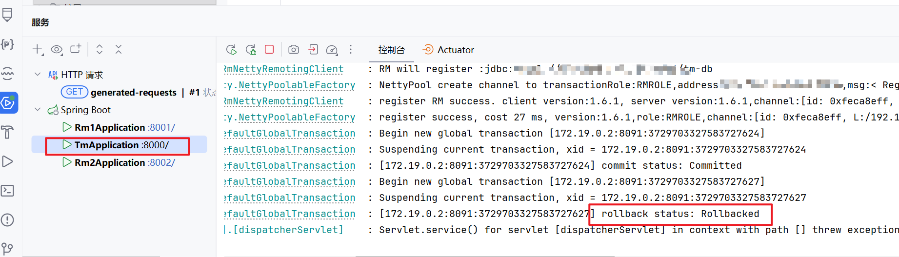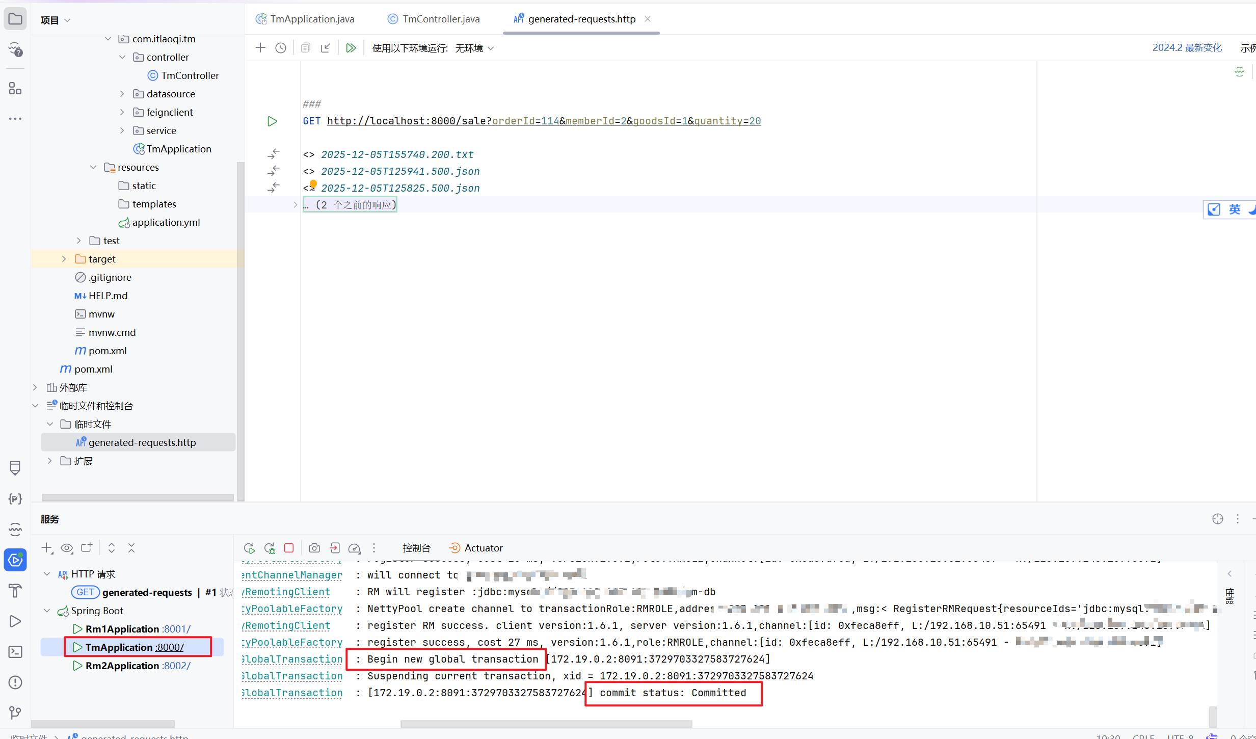 在tm的控制台,可以看到开始全局事物,提交事物的相关日志。