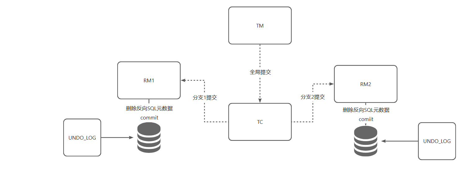 事物管理者(TM)下达全局提交的指令给到事物协调者(TC),RM1、RM2都执行完毕,且没有出现任何问题,此时会将上一步产生的反向SQL删掉,整个过程结束。
