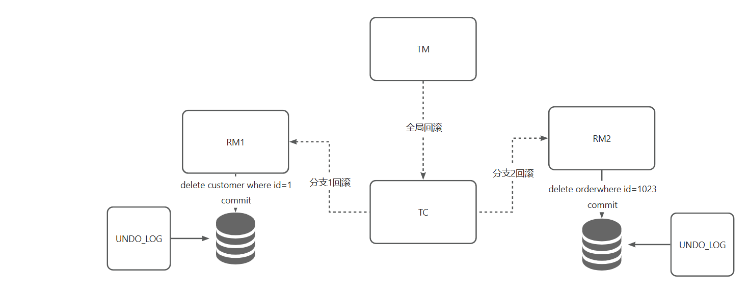 当阶段一中任何一个资源管理器(RM)执行出错,事物管理者(TM)下达全局回滚的指令给到事物协调者(TC),RM1、RM2执行阶段一产生的反向SQL,将之前插入的记录根据ID从数据库中删除,保证数据一致性。
