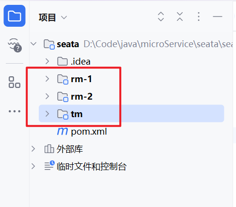 整个示例项目由三个独立的应用程序组成,tm代表事物管理者,rm1、rm2分别代表两个资源管理者。