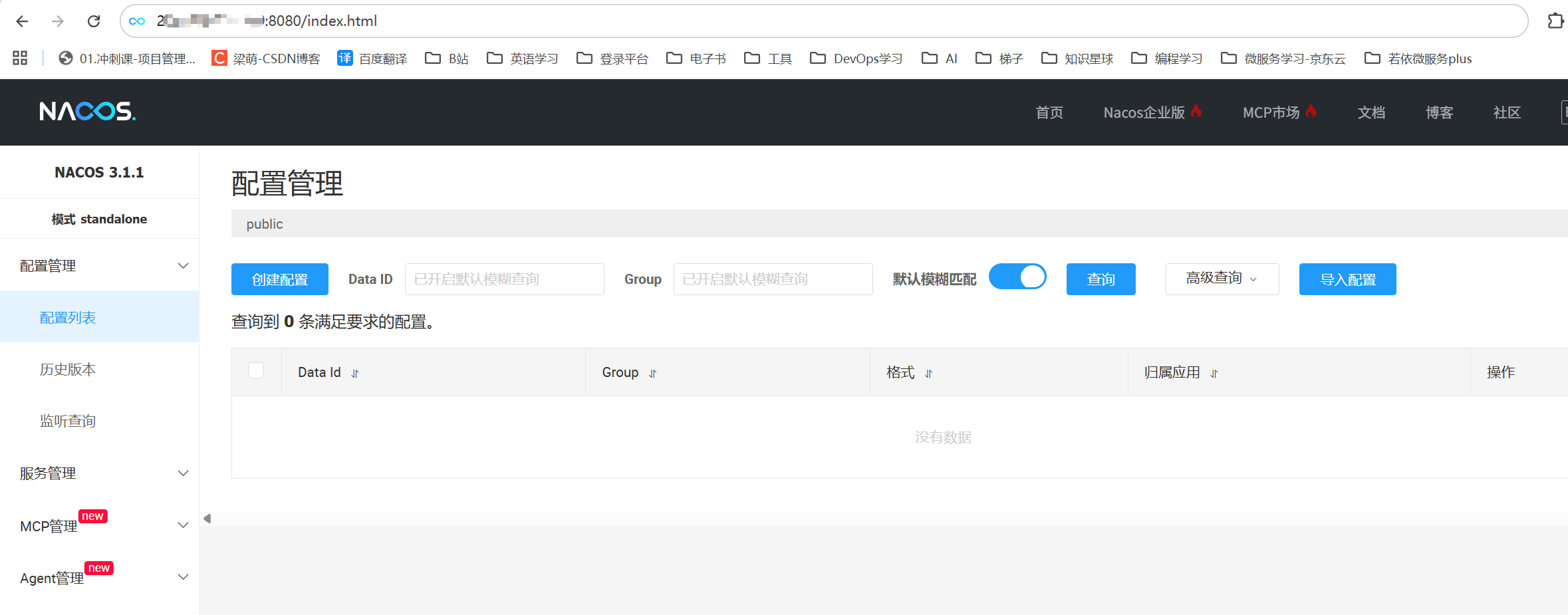 浏览器访问 nacos所在服务器的ip+8080端口,便可以访问nacos管理控制台。