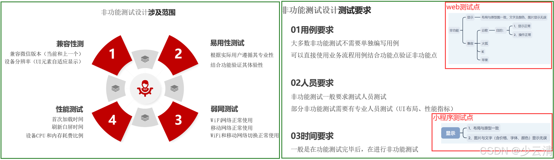 - 非功能中(显示和兼容),整个项目只测试一个就可以,不需要每个模块都去写。写2条用例就可以(写太多太冗余)