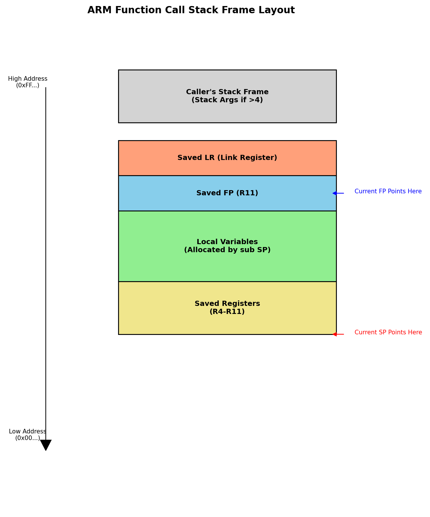 - FP (Frame Pointer): 栈底指针 (R11),用于定位局部变量 (可选)。