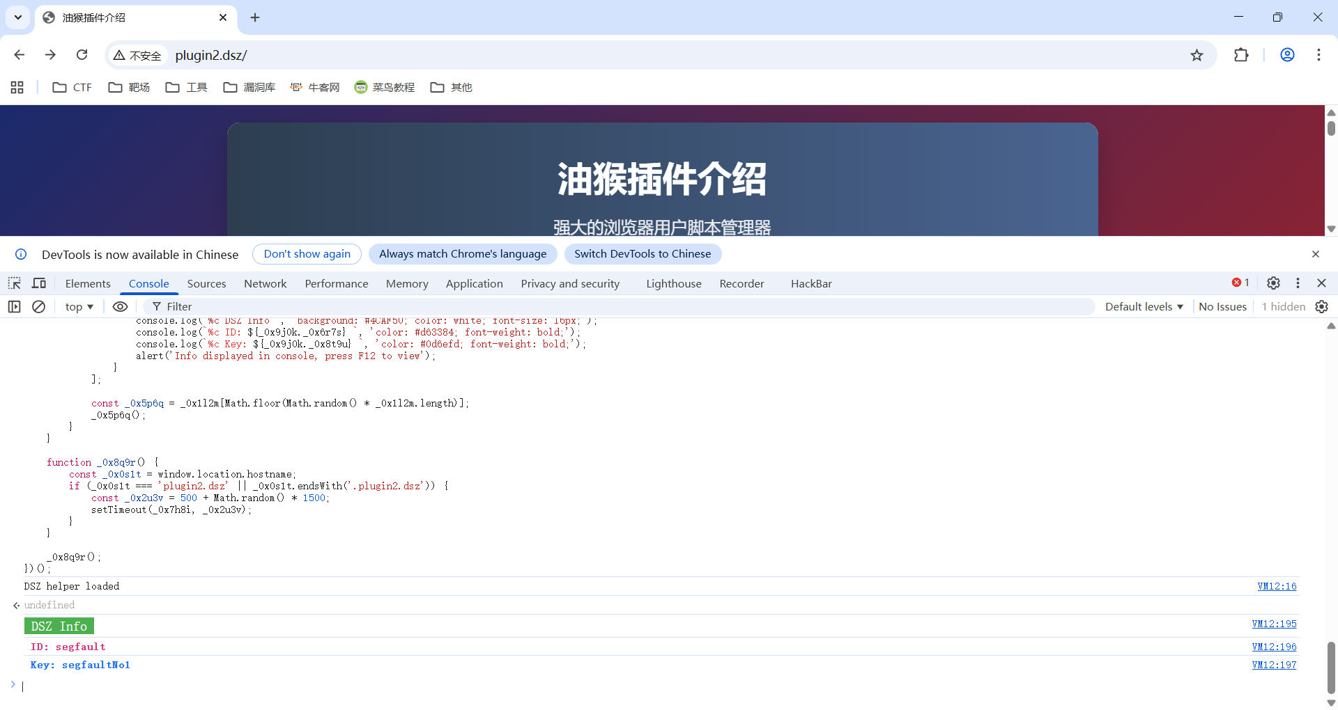 脚本执行的操作:当访问 plugin2.dsz 或其子域名 时,通过多种加密 / 字符变换方式 生成一组「ID + Key」信息,并随机选择弹窗、页面悬浮窗、控制台输出三种方式展示该信息。