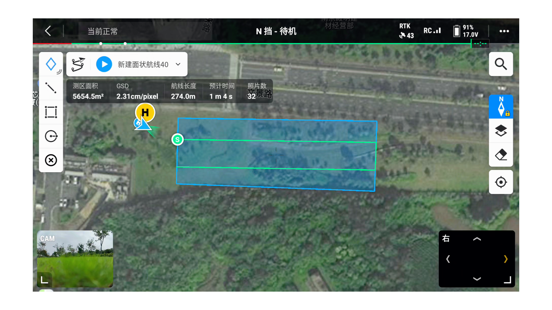 建图航拍:最常用的模式,通过自动生成"弓"字形航线获取正射影像,用于生成二维地图和DSM。