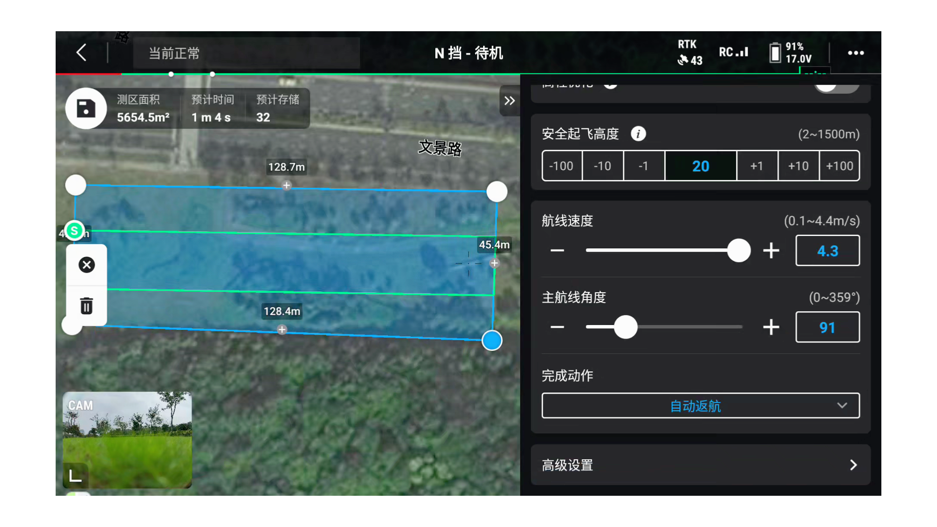 其他参数:设置航线速度(通常可设置最高15m/s)、完成动作(如自动返航)等。