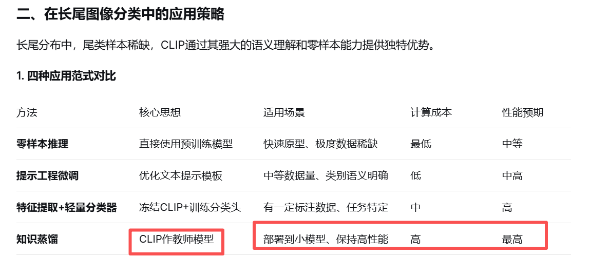结合你之前了解的知识蒸馏,可以将CLIP作为教师模型: python 复制 下载 def distill_clip_to_small_model(teacher_clip, student_model, dataset): """ 将CLIP知识蒸馏到小模型,特别保留对尾类的识别能力 """ # 使用CLIP为数据集生成软标签(包括零样本预测) soft_labels = generate_soft_labels_with_clip(teacher_clip, dataset) # 传统蒸馏损失 + 对比蒸馏损失 loss_fn = CombinedDistillationLoss( temperature=4.0, alpha=0.5, # 平衡系数 contrastive_weight=1.0 # 对比学习损失权重 ) # 训练学生模型 train_student_with_distillation(student_model, teacher_clip, dataset, soft_labels, loss_fn)