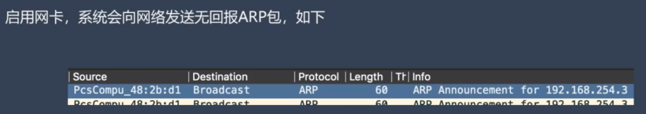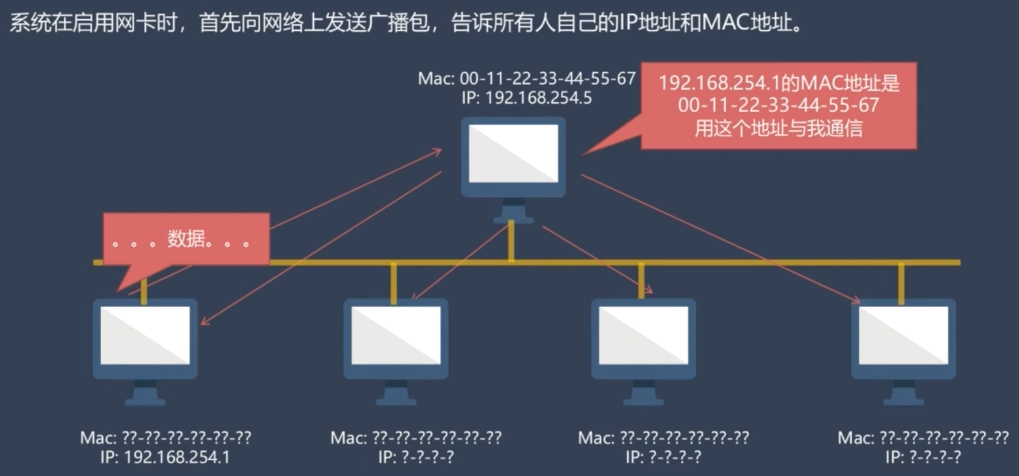 不妨设定:主机启用网卡的时候,自动在网络上广播自己的IP地址&&MAC地址,表示我已经上线了,方便网络当中的其他主机能感知到你的存在