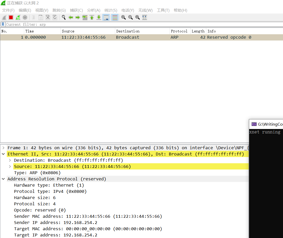 使用wireshark抓包,全速运行xnet软件,得到无回报ARP包