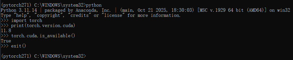 Anaconda23.7.4,python虚拟环境3.11,本机NVIDIA显卡驱动CUDA Version: 11.1,Pytorch2.7.1,CUDA11.8。