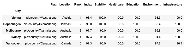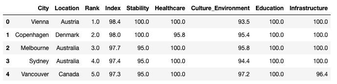 columns_titles = ["City", "Location", "Rank", "Index", "Stability","Healthcare", "Education", "Culture_Environment","Infrastructure"]