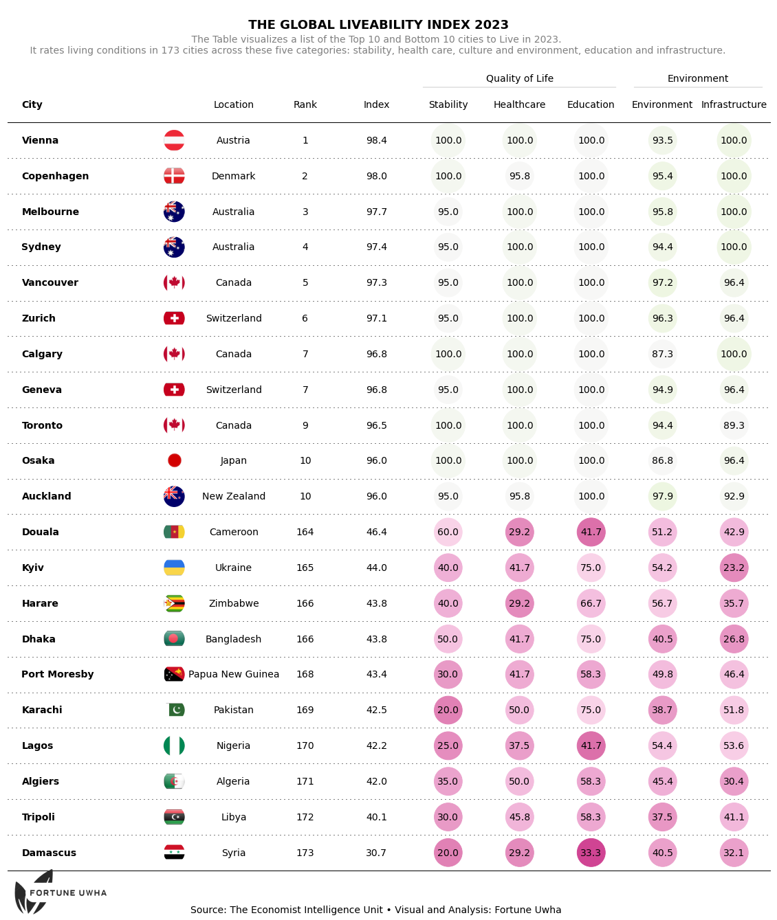 subtitle_text = "\n The Table visualizes a list of the Top 10 and Bottom 10 cities to Live in 2023. \n It rates living conditions in 173 cities across these five categories: stability, health care, culture and environment, education and infrastructure."