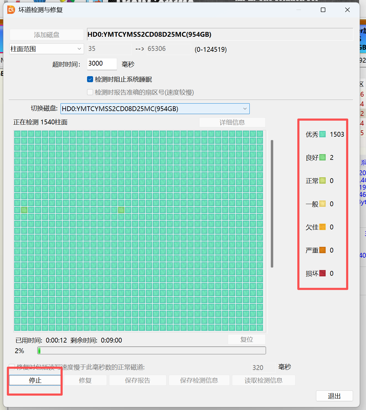 注意:物理坏道若较多(超过10个红色块),建议更换硬盘,避免数据丢失。
