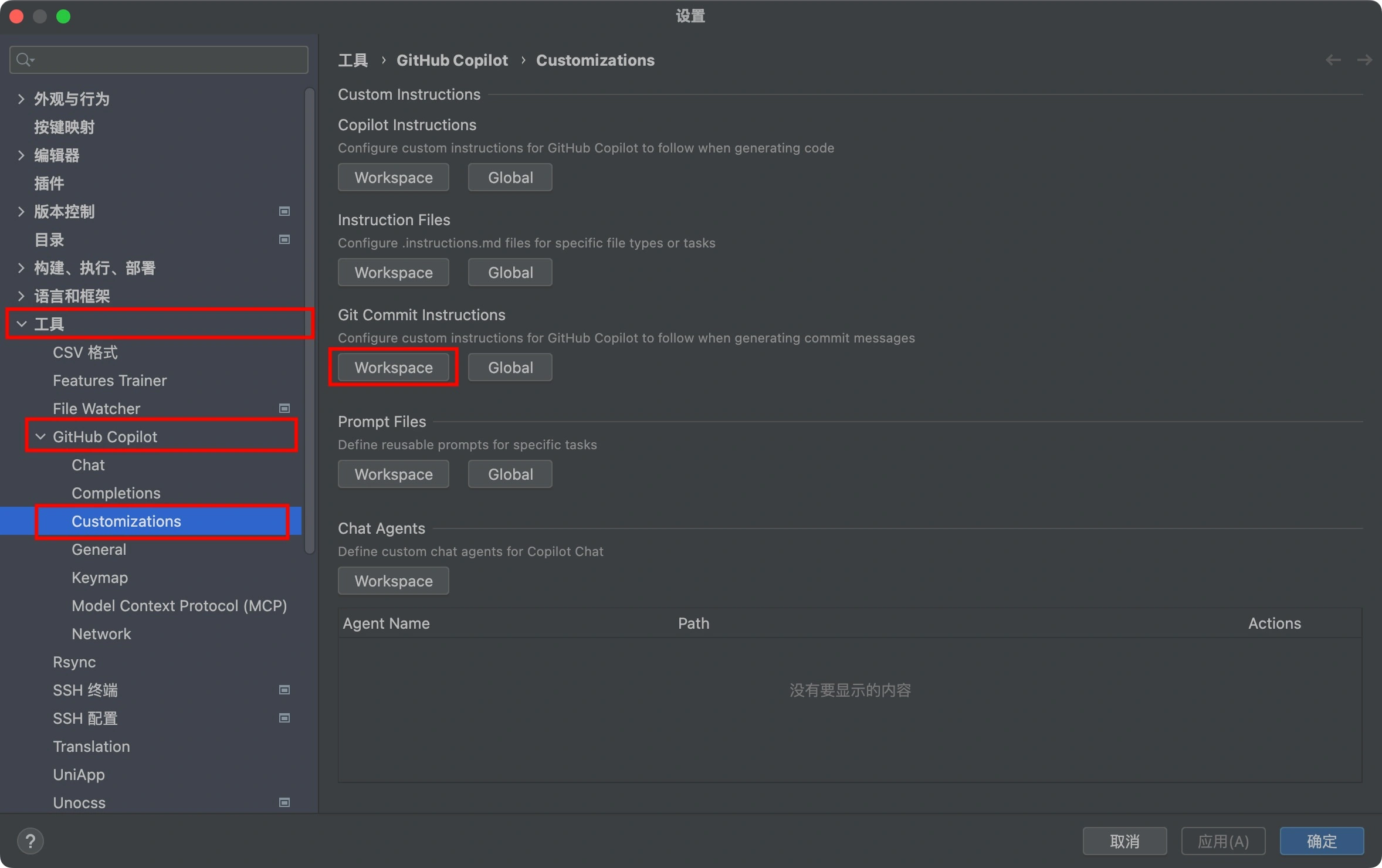 - 设置 > 工具 >GitHub Copilot>Customizations>Git Commit Instructions> Workspace 【Workspace 只对当前项目生效,如果选择Global 则对全局所有项目都生效】