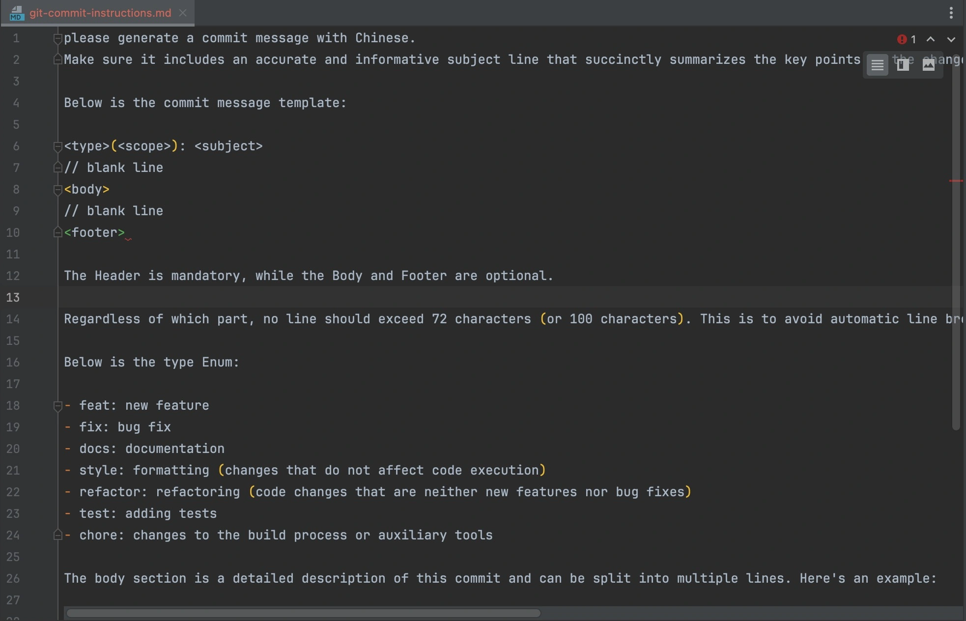 - 在打开的git-commit-instructions.md 复制上面的提示语