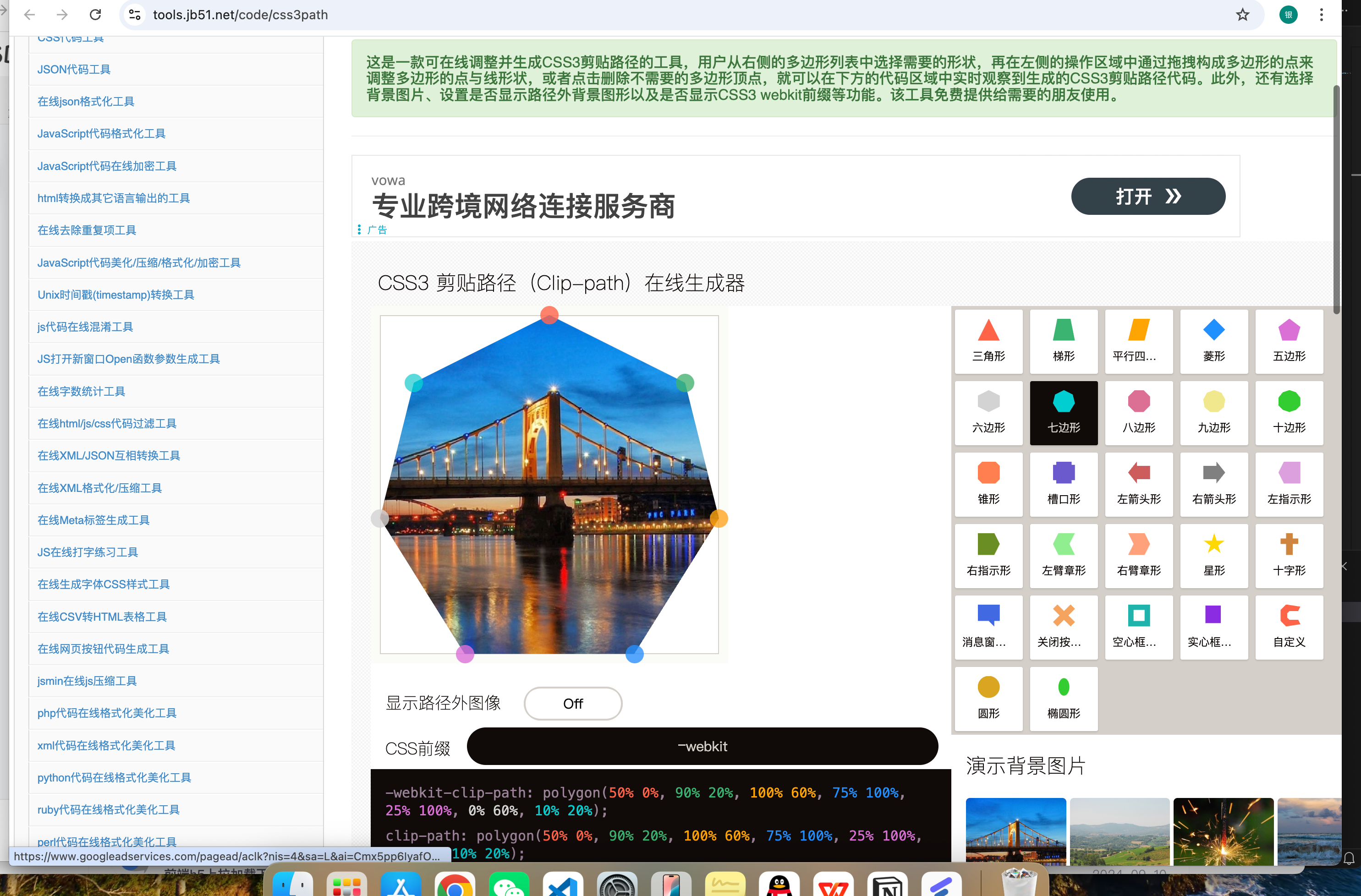 6、用于生成 CSS 的 clip-path 属性代码。支持通过可视化操作调整图形的形状,比如多边形、不规则图形等,无需手动计算坐标,生成的代码可直接用于实现元素的特殊裁剪效果。