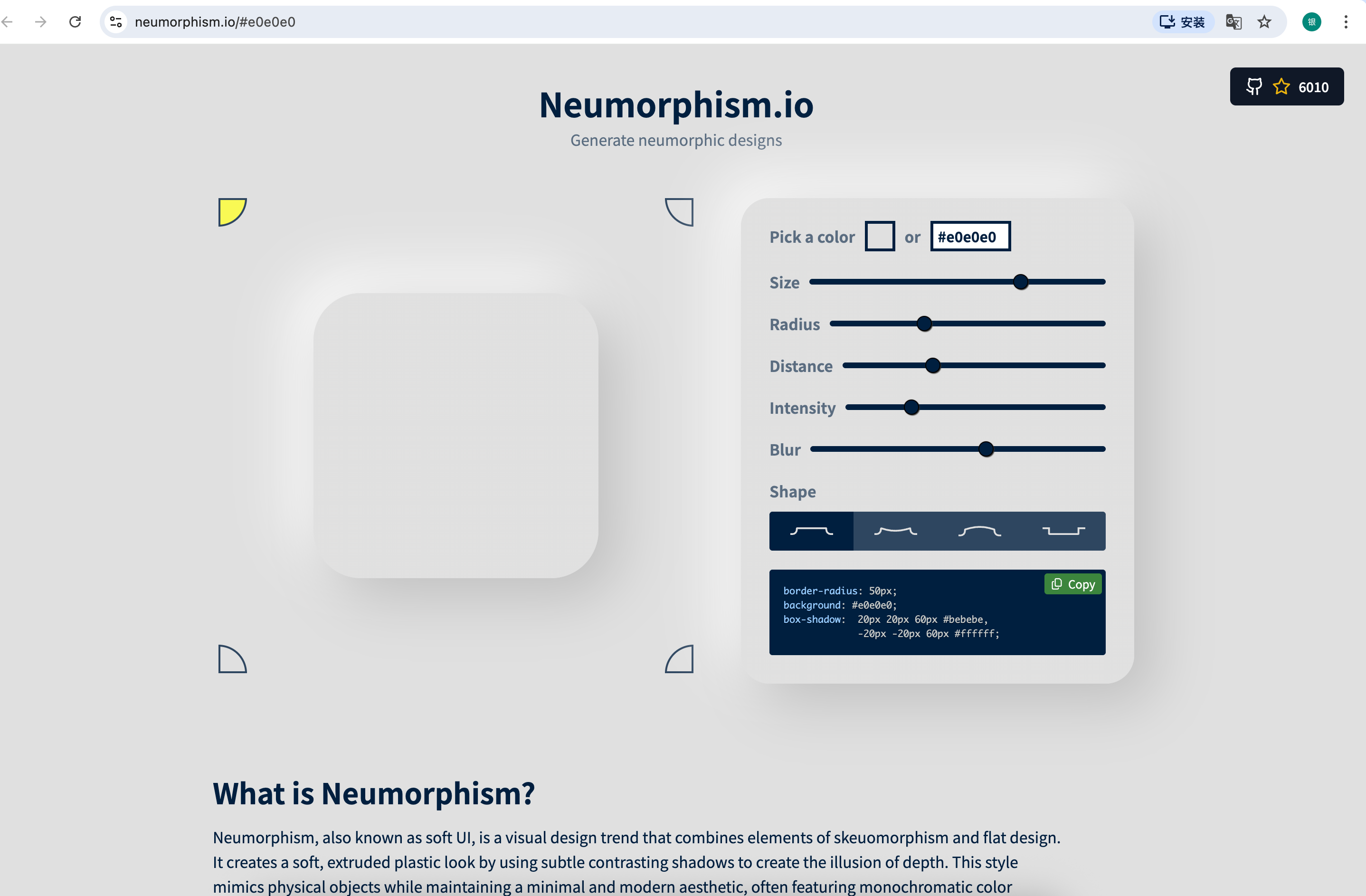 3、可轻松实现新拟态效果,能修改颜色、尺寸、半径等参数,并提供可直接复制的 CSS 代码。
