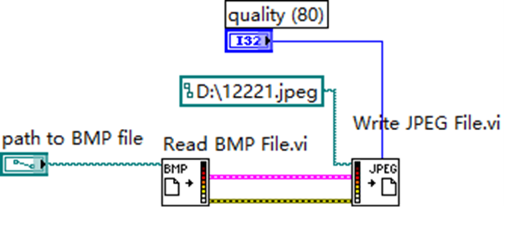 Write JPEG File.vi,将上一步的 "图片数据" 作为输入,同时指定 JPG 文件的保存路径,并设置质量参数(范围 0~100,数值越高画质越好但文件越大,工业场景常用 80 以平衡画质与体积);