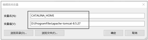 CATALINA_HOME 环境变量用来指定 Tomcat 的安装路径,为可选项。配置过程同上,打开"环境变量"管理页面,在系统变量中创建 CATALINA_HOME 环境变量,如下图所示。