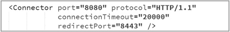 【情况二】如果启动失败,提示端口号被占用,则将默认的 8080 端口修改为其他未使用的值,例如 8989 等。具体操作步骤如下,打开 Tomcat 解压目录下"conf\server.xml"文件,找到第一个 <Connector> 标签,修改 port 属性值,如下图所示。