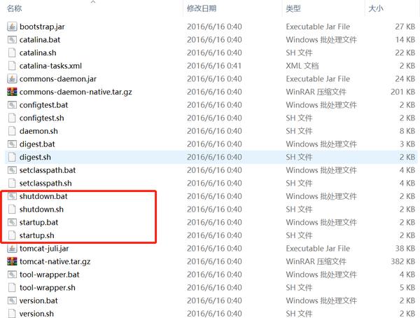 .sh结尾的 Linux 命令,另一类是以.bat结尾的 Windows 命令。很多环境变量都在此处设置,例如 JDK 路径、Tomcat 路径等。