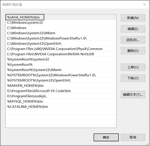 ⑤ 找到"系统变量"的 Path 变量,将"%JAVA_HOME%\bin"加入 Path 环境变量中,并单击"确定"按钮,如下图所示。