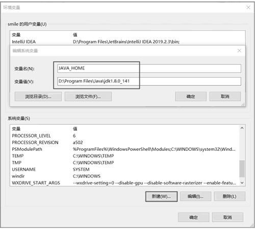 ④ 在系统变量中单击"新建"按钮,创建"JAVA_HOME"变量,对应的变量值为 JDK 安装目录,如"D:\Program Files\Java\jdk1.8.0_141",如下图所示(注意,这里先检查是否已经配置该环境变量,没有配置再新建)。