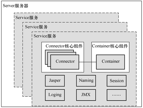Connector 连接器和 Container 容器是 Tomcat 的核心。一个 Container 容器和一个或多个 Connector 连接器组合在一起,加上其他一些支持组件共同组成一个 Service 服务,有了 Service 服务便可以对外提供服务能力。